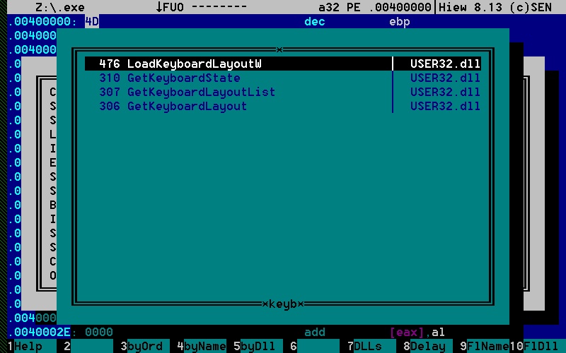 попросим хиев показать только те функции, названия которых содержит keyb - F9(фильтр)